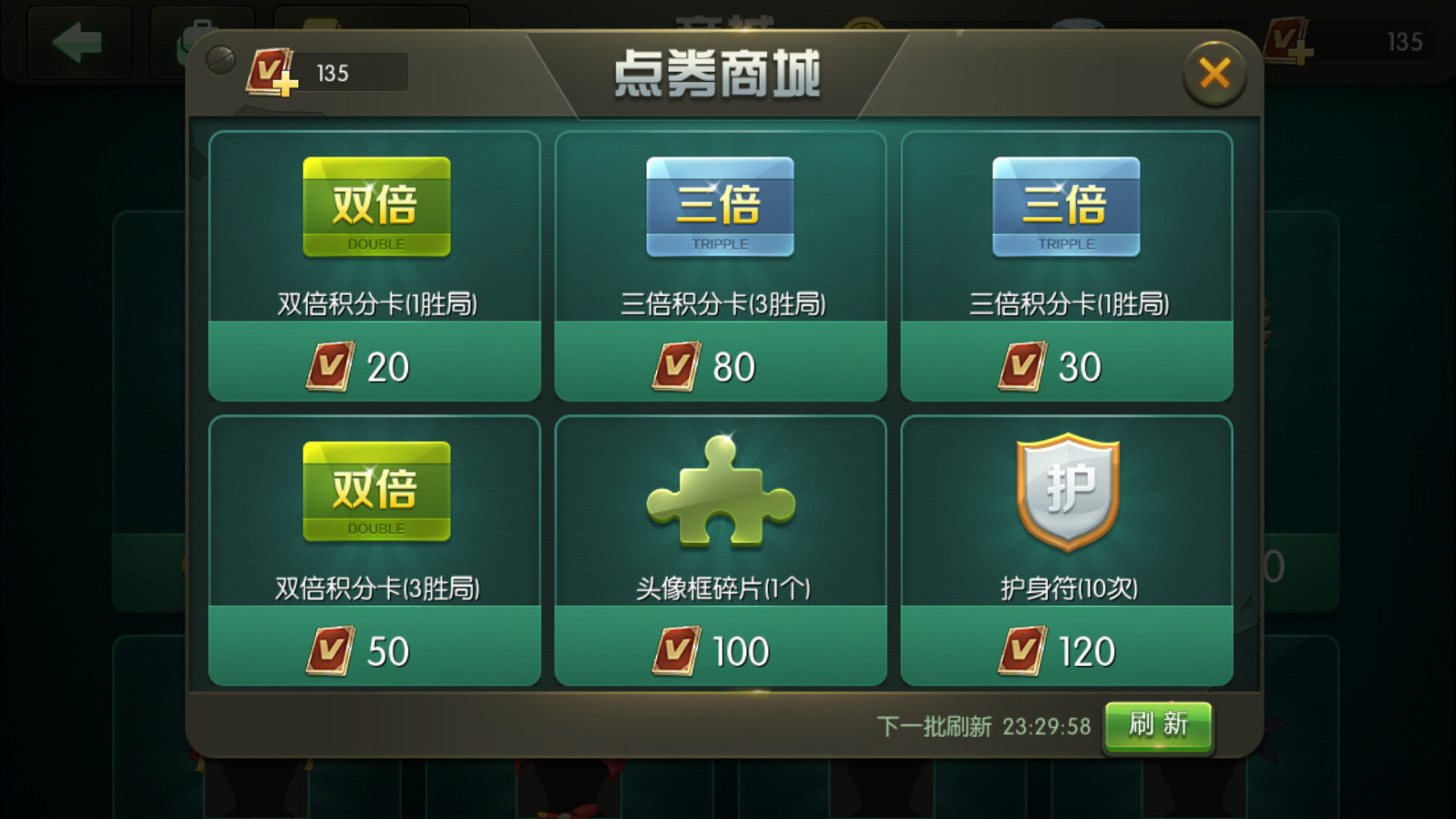 vip玩家可以通过钻石兑换点券在此购买各种道具,道具种类为随机刷新。也可以花费点券主动刷新。许多道具可以让玩家有的事半功倍的效果,比如三倍积分卡,可以让玩家获胜后获得的积分为正常情况下积分的三倍。护身符可以输了之后不扣分。