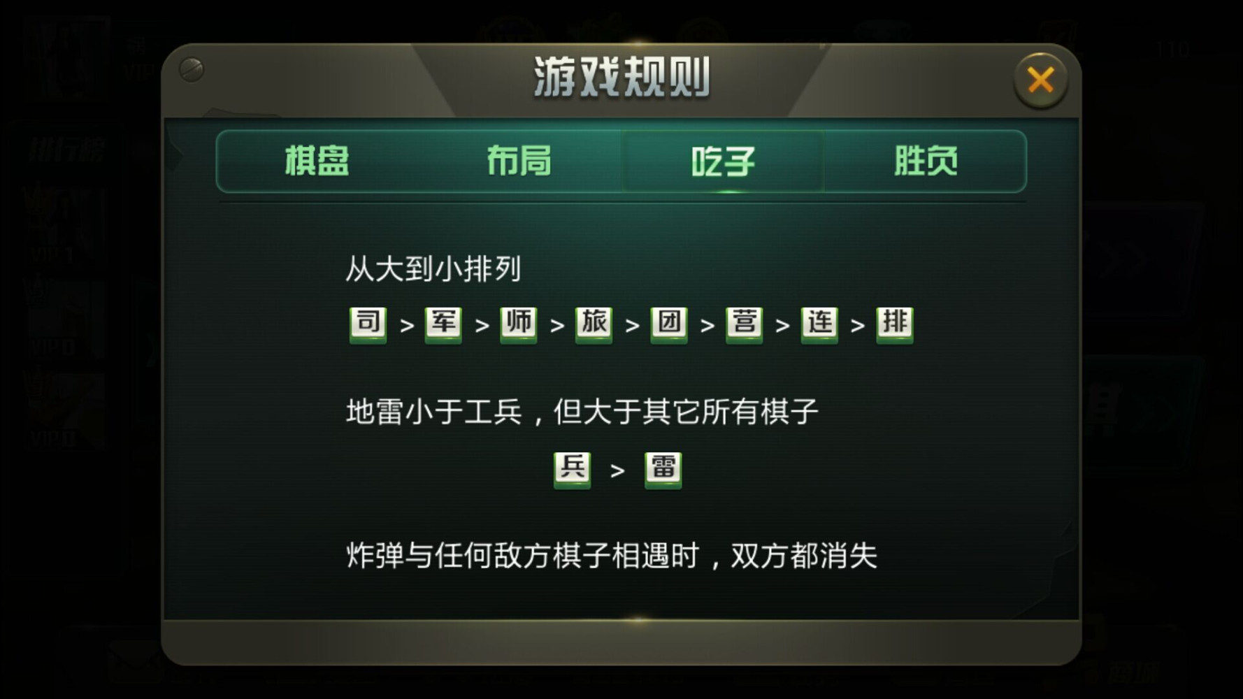 司令> 军长 > 师长 > 旅长 > 团长 > 营长 > 连长 > 排长 > 工兵,小棋遇大棋被吃,相同棋子相遇,则同归于尽;工兵能排除地雷,其他棋子不能排雷;炸弹与任何棋子相遇时同归于尽