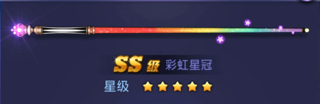 可以进阶至SS级的球杆,球杆顶部镶嵌一个巨大的宝石皇冠,散发着迷人的光芒,杆身仿佛用彩虹制作而成,七色光芒闪耀变幻犹如童话般的色彩,让人赏心炫目。小师妹也不止一次的幻想着在桌球对局中能遇到一位帅气成熟、幽默又不失风度,手持彩虹星冠的帅哥,一起切磋,一起探讨桌球,然后~(啊呀,好羞射,不能再想了啦~